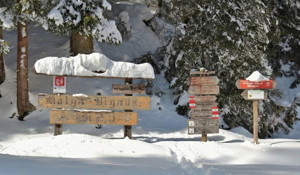 All’arrivo in rifugio a Malga Dignas potremo riposare e rifocillarci, godendo dell’atmosfera incantata dell’alta quota in inverno, dove tutto è luce e candore.